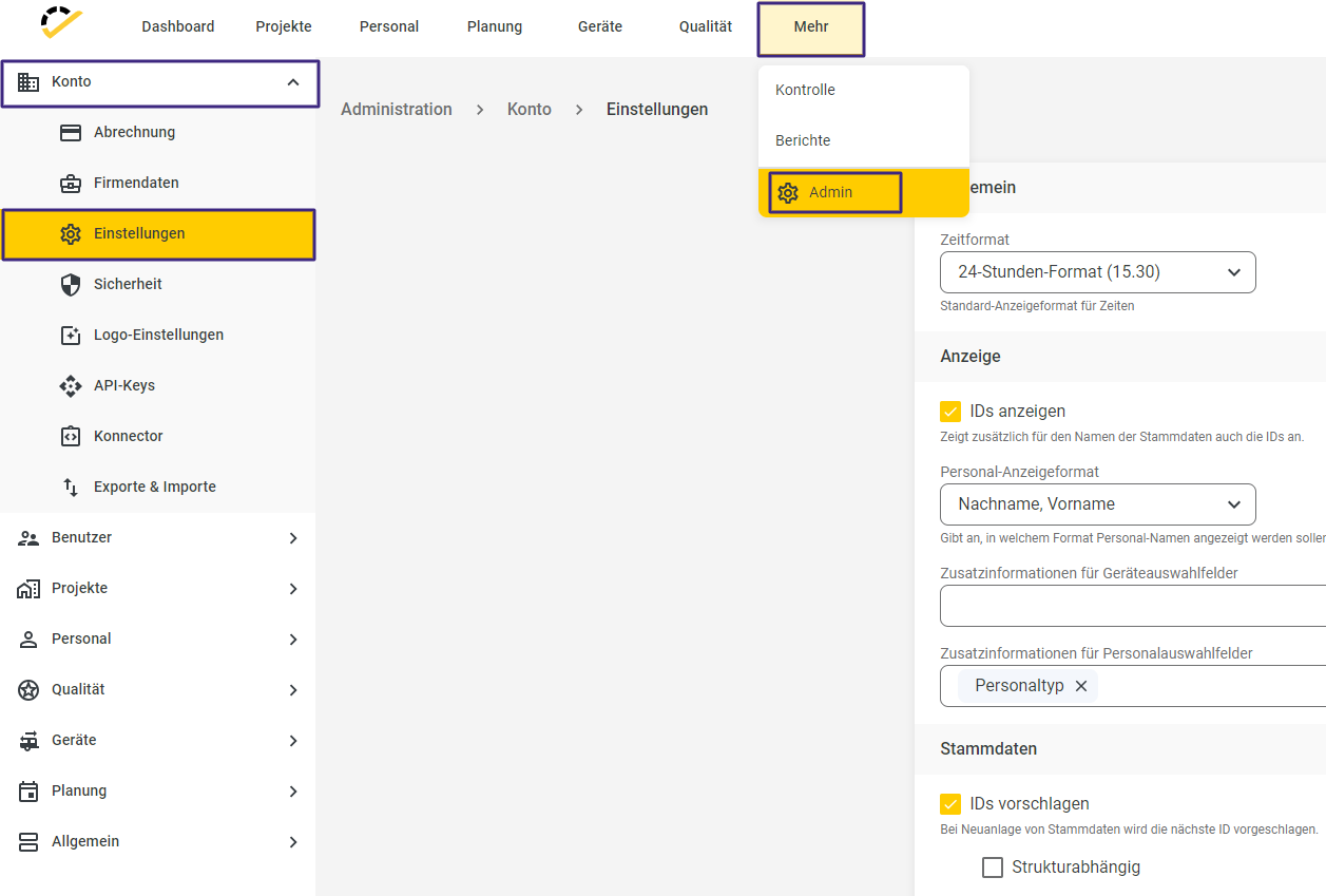 Navigiere zu Mehr -> Admin -> Konto -> Einstellungen.