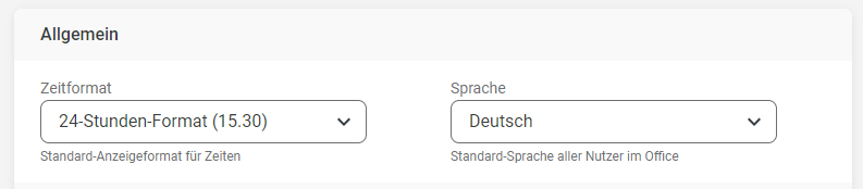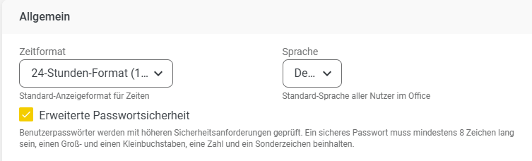 Im Bereich Allgemein stellst du das Zeitformat, die Sprache und die Passwortsicherheit des 123erfasst Offices ein.
