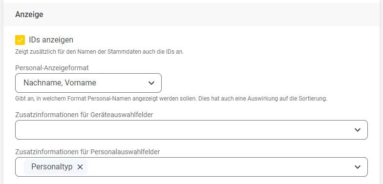 Setze den Haken bei IDs anzeigen, wenn dir in Auswahlfeldern neben dem Namen der jeweiligen Stammdate auch die ID angezeigt werden soll.