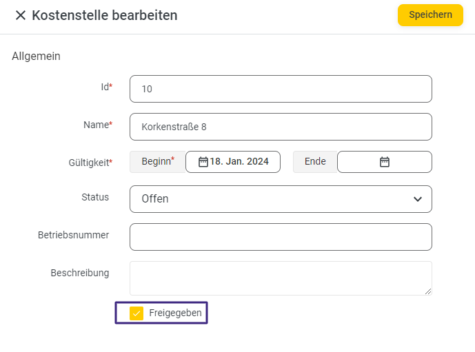 Mit der aktivierten Checkbox Kostenstellen bei der Neuanlage von Projekten automatisch freigeben wird bei einer neuen Kostenstelle, die automatisch durch das Erstellen eines Projekts angelegt wird, der Haken bei Freigegeben gesetzt.
