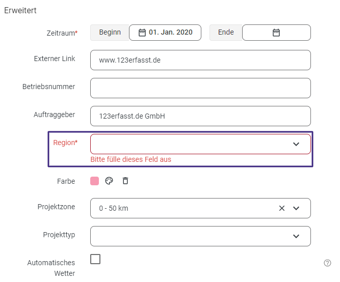 Mache das Feld Region in den Projektstammdaten zu einem Pflichtfeld, indem du die Checkbox Region in Projekten Pflichtangabe aktivierst.