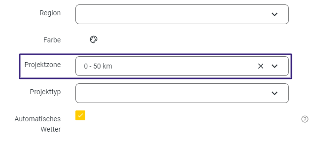 Sind die Voraussetzungen erfüllt, wird die Projektzone im Projekt anhand der automatischen Berechnung der Distanz vom eingetragenen Projektstandort zum Firmensitz hinterlegt.