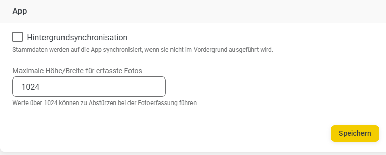 Aktiviere die Checkbox Hintergrundsynchronisation, wenn die Synchronisation von Stammdaten auch dann erfolgen soll, wenn die App nicht im Vordergrund des Smartphones geöffnet ist. Bei dem Punkt Maximale Höhe/Breite für erfasste Fotos, kannst du die Größe deiner erfassten Bilder festlegen.