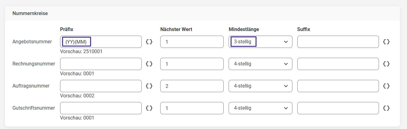 Wenn du möchtest, dass deine Angebote, Aufträge, Rechnungen, oder Gutschriften immer mit dem aktuellen Jahr und Monat und dann einer fortlaufenden dreistelligen Nummer als Belegnummer versehen werden, dann lege den Nummernkreis bspw. wie folgt fest.